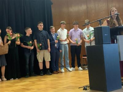 Ihre Klassenkameradin Anastasia Ständer zeigte sich ebenfalls melancholisch gestimmt: Sie dankte ihren Lehrern, die sie „durchgeboxt“ hätten, den Eltern, die sie alle in dieser Zeit ertragen hätten, auch wenn alle mal wieder an den Hausaufgaben verzweifelten - und sie dankte insbesondere ihrer Klassenlehrerin Frau Meister, die sie immer wieder mit ihrem optimistischen Aufruf „Auf geht’s!“ ermuntert und ihnen optimale Ratschläge gegeben habe. Ihrerseits habe Frau Meister selbst auch die beste Ausrede gehabt, wann immer sie einmal zu spät gekommen sei: „Sorry, ich musste noch was mit Frau Roßbach besprechen.“ Mit ihrem schönen Lächeln habe sie immer an sie geglaubt, auch wenn jemand etwas beim fünften Mal noch nicht verstanden habe: „Bitte denken Sie auch später an uns.“