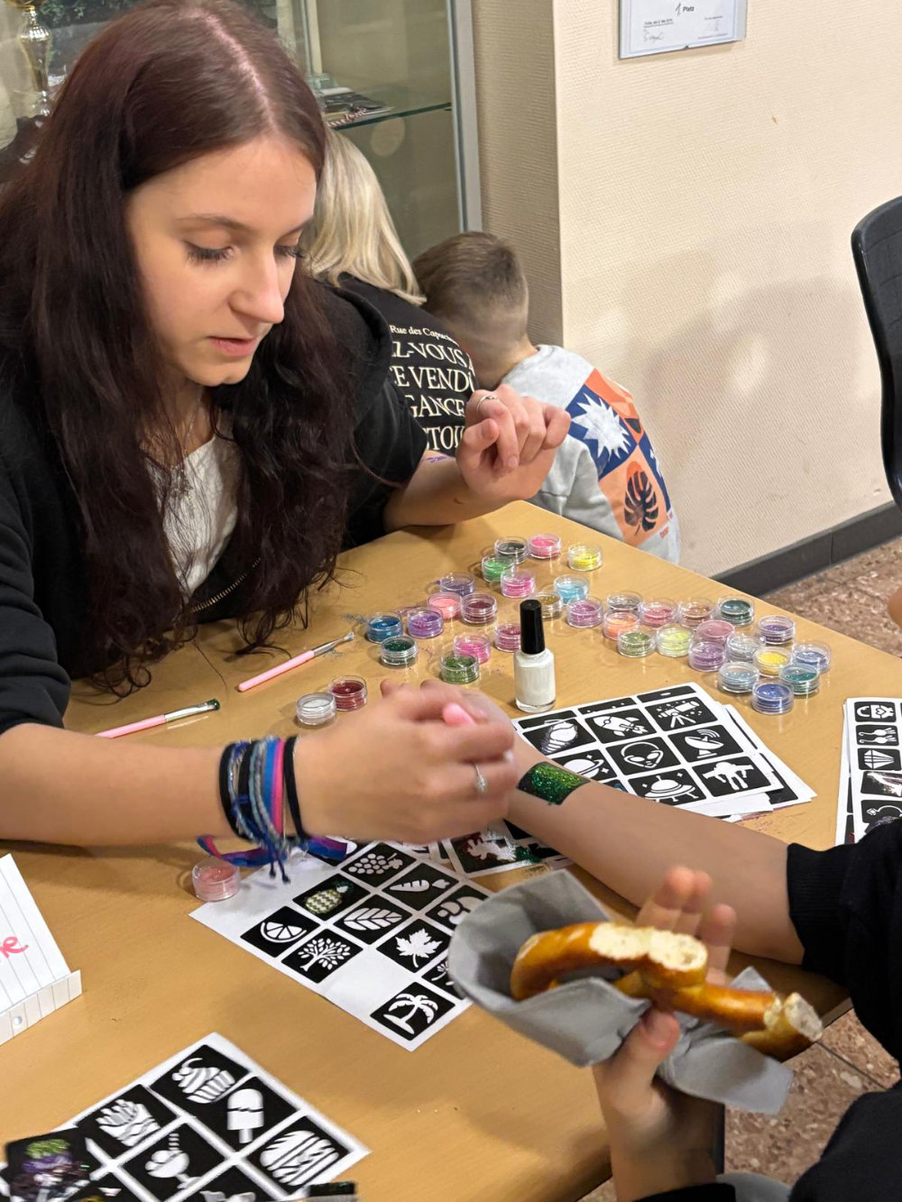 Ein strahlender Höhepunkt des Abends war das Engagement der Q3. Geduldig und kreativ zauberten die Oberstufenschülerinnen und -schüler Glitzertattoos mit märchenhaften Motiven wie Cinderella und fantasievollen Bildern von Einhörnern und Regenbögen für die Kleinen. Dazu entstanden schöne Armbänder aus bunten Steinen, jedes ein kleines Unikat.
