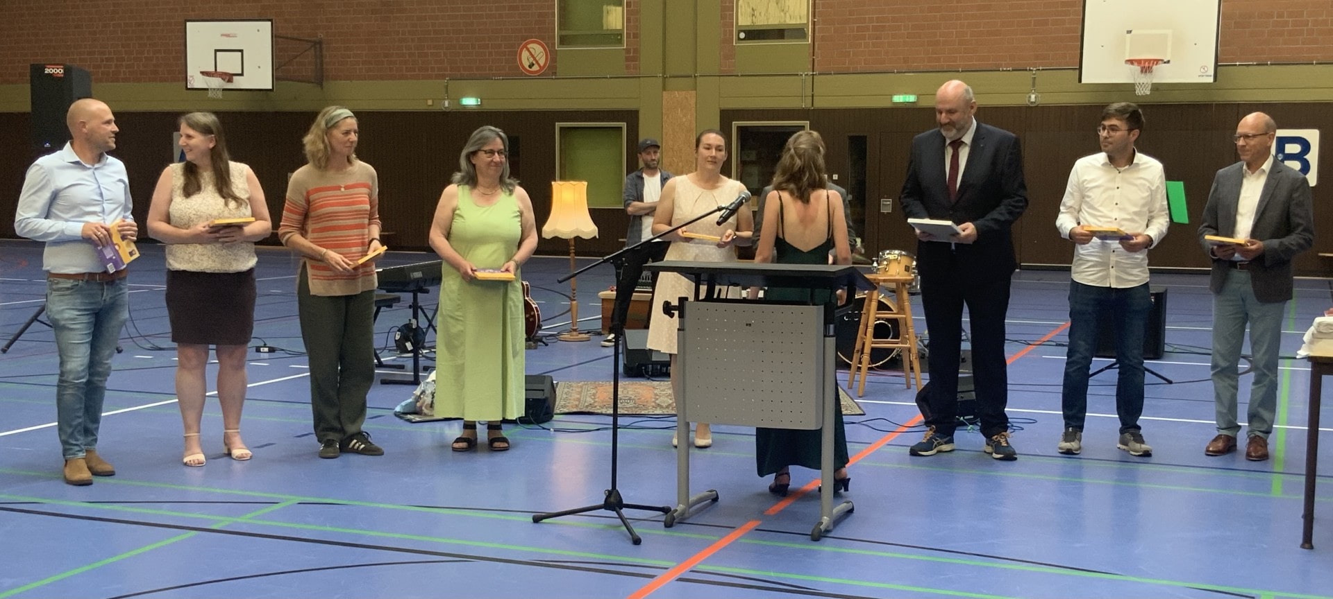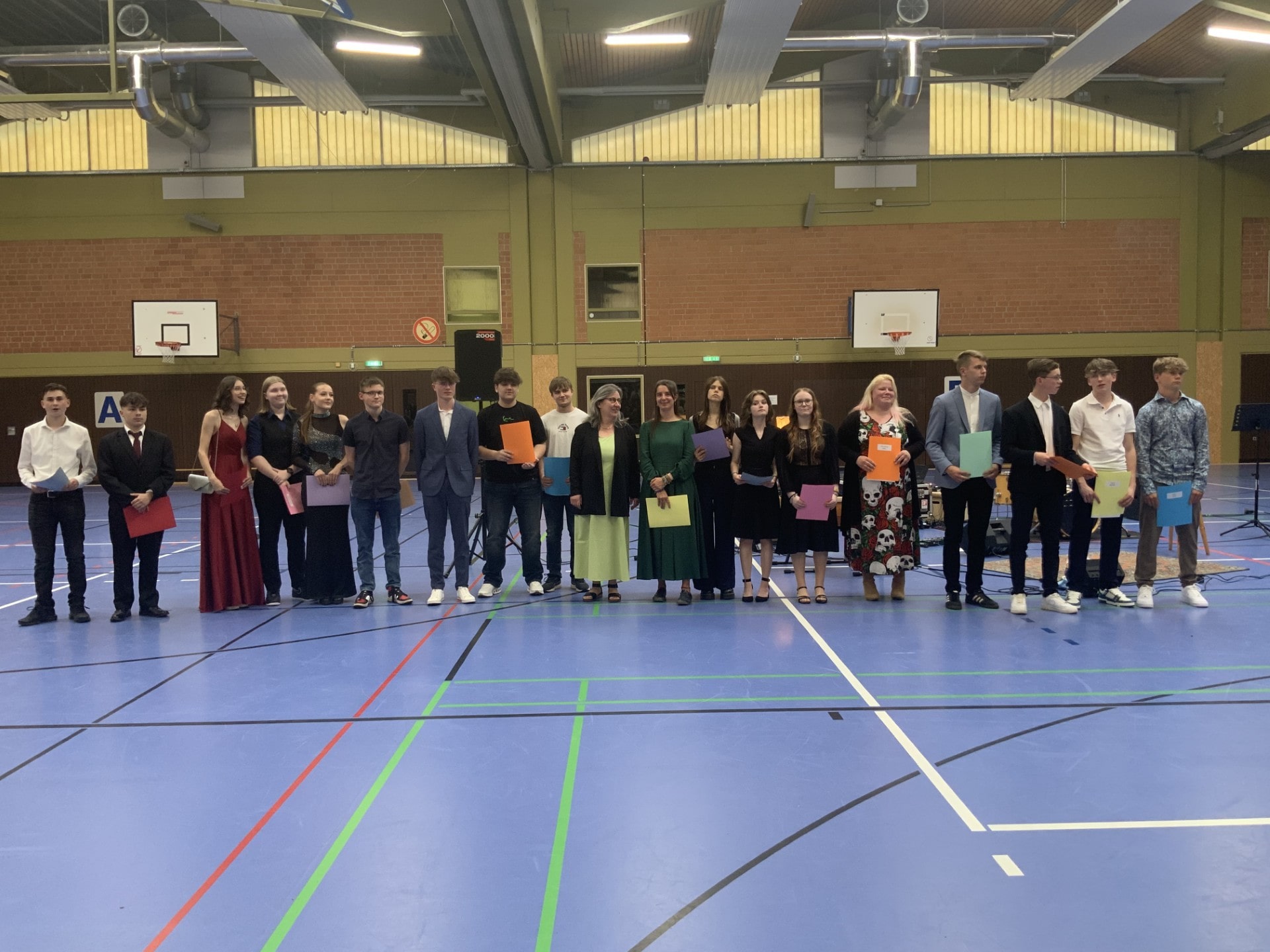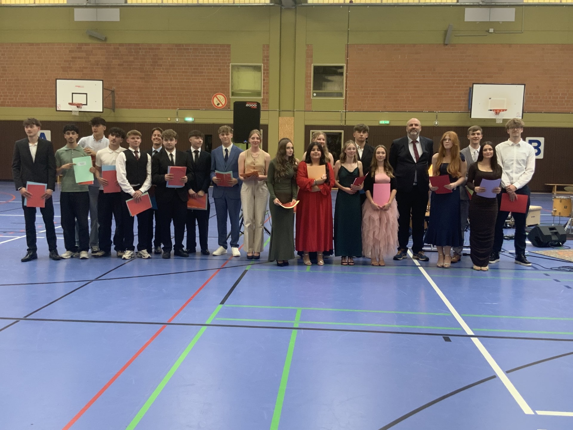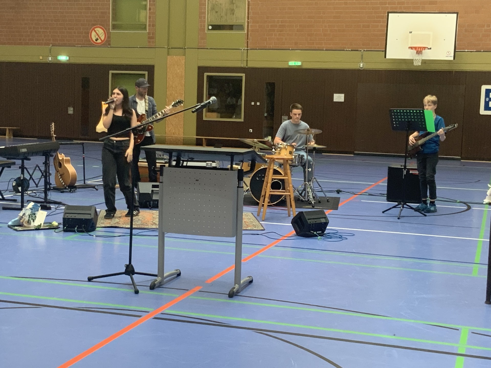 Schulzweigleiter Christian Marchewka als Moderator des Abends gibt seiner Freude darüber Ausdruck, dass nach den „Clefs“ schon wieder eine von Christian Wiechert geleitete Schüler-Band bereitsteht, um Feiern wie dieser einen angemessenen Rahmen zu verleihen. Neben den Vokalistinnen Emily Neumann und Hannah Marchewka sind es heute Abend Jannik Tölle, Josh Kenter, Mattis Kämmer und Christian Wiechert selbst, die das Publikum mit attraktiven Titeln wie „River“ und „Murder on the Dance Floor“ in Begeisterung versetzen.