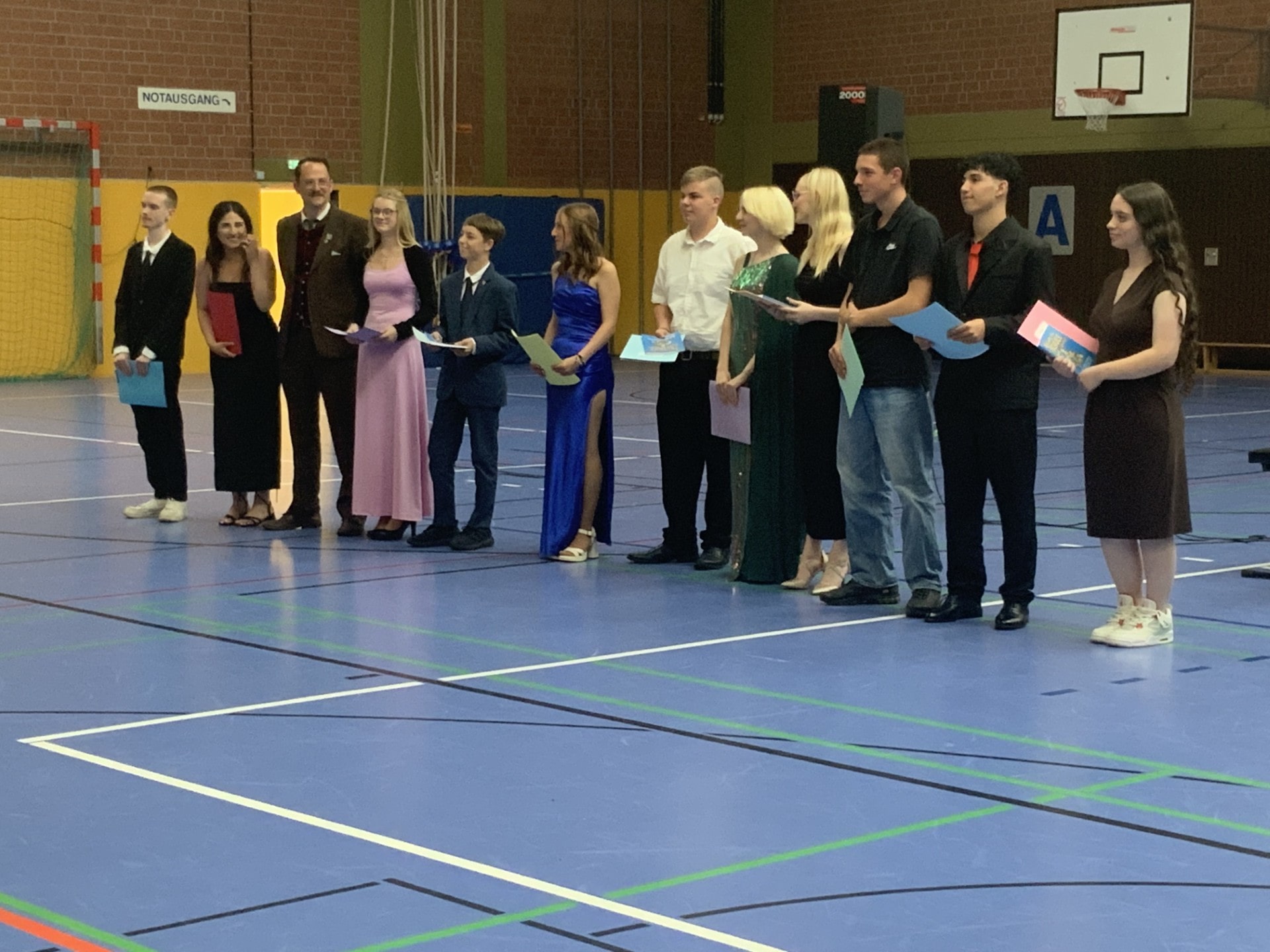 In diesem Rahmen ehrt Christian Marchewka zunächst die Klassenbesten: Diese Würdigungen gehen an Jennifer Marhold aus der Klasse H9 , an Rabea Schnaubelt aus der R10a mit einem Notendurchschnitt von 1,6 und an Mila Bauer aus der R10b mit der Durchschnittsnote 2,0.